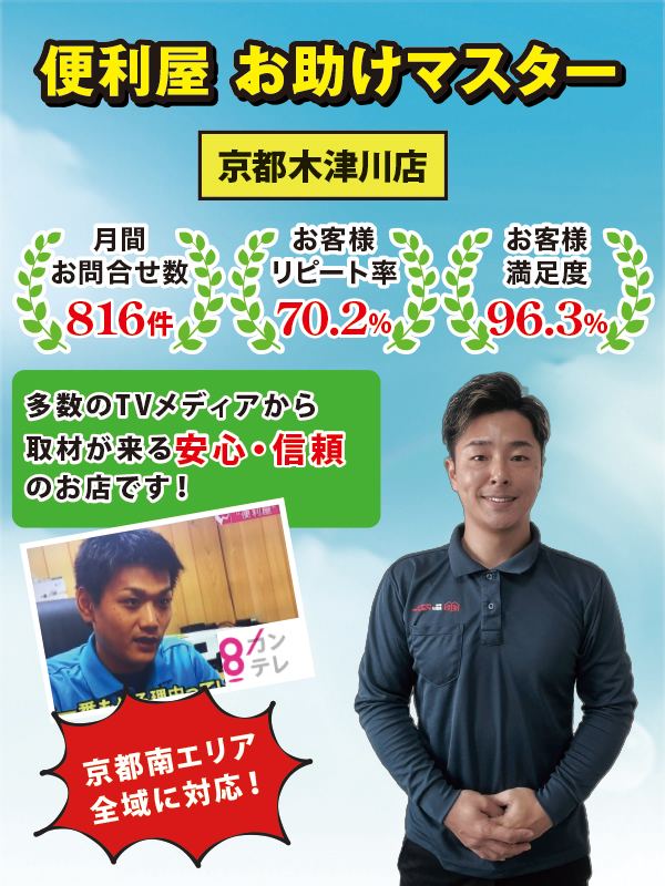 この度は便利屋お助けマスター京都木津川店にご来店いただきまして誠にありがとうございます。当社では「格安」を売りにしているわけでは無く、決して大手の便利屋さんでもありません。しかし、そんな中当社をお選びいただけたお客様には必ず「選んでよかった」 と言っていただけるサービスのご提供をお約束いたします。